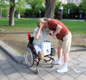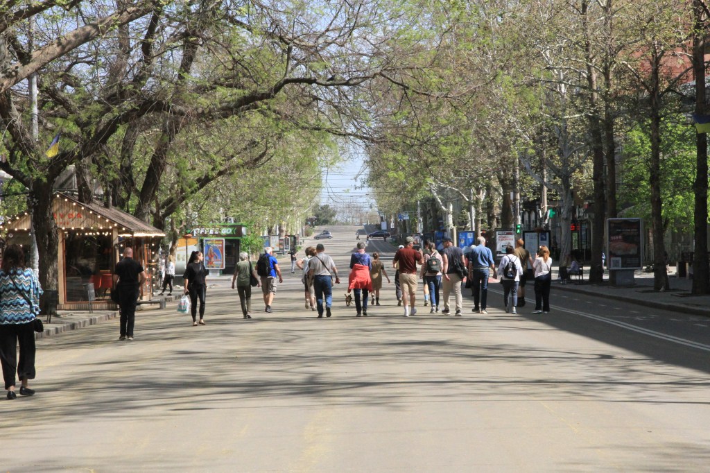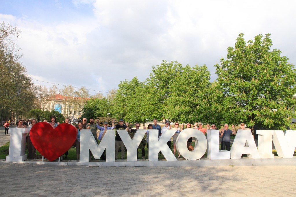 Onsdag 23.4. Kaffe med croissant i parken som frukost. Lätt vind, men den sneda solen värmer. En äldre man spelar nationalsången på trumpet. Samlar in pengar till armén. Klockan nio hålls varje dag en tyst minut i Mykolaiv. Allt omkring oss stannar upp.
