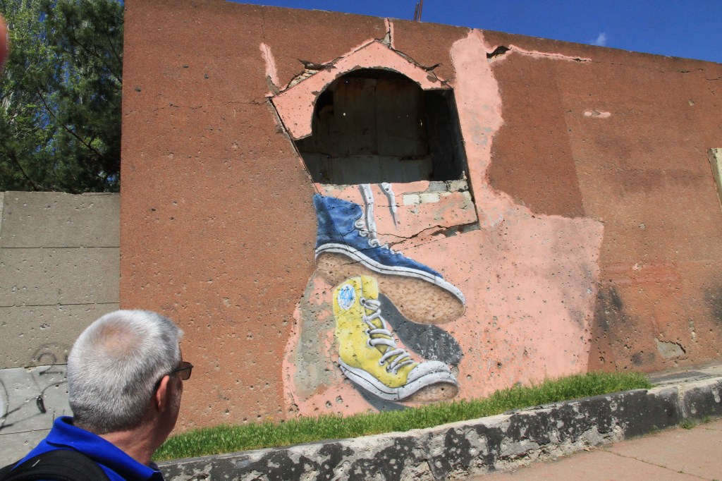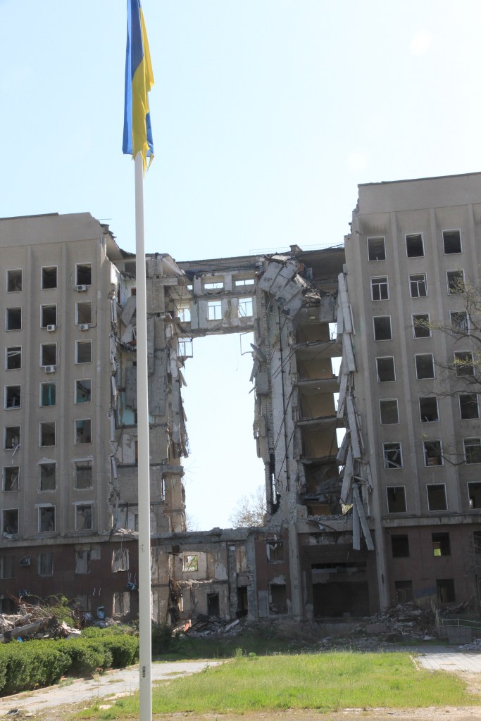 När ryssarna insåg att de inte snabbt kunde ta Ukraina så övergick de till terrorbombning. Enligt Eugene så använde ryssarna gamla kartor. Då var huset en militär ledningscentral. Nu, tjugo år senare, låg där en butik för jordbruksredskap. I buss åkte vi runt och visades platser som bombats. Den senaste för en månad sedan.