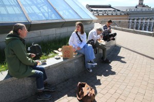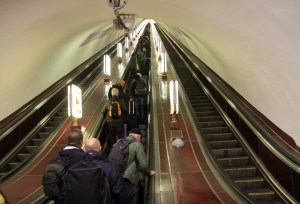 Lördag 26.4. Anlände tidigt till Kyiv. Metro till vårt hotell vid Maidan. Tunneltågen går snabbare än i Stockholm, det är långt mellan stationerna och uppehållen är kortare. Rulltrapporna upp från plattformen tar oändlig tid. Allra längst vid stationen Arsenal – 4 min 15 sek. Och trapporna rullar fortare än i Stockholm. Allt tycks gå snabbare i Ukrainas huvudstad. Även bilarna, tyvärr.