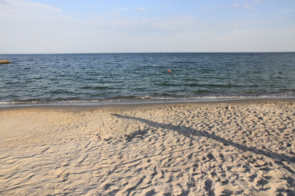Väster om hamnen ligger badstranden. Det var en bit att gå, men hela vägen genom lummiga parker. Ira köpte tre flaskor vin i en-liters plastflaskor som tappades upp på plats. Dessutom snacks av torkad krabba, fisk och bläckfisk. De flesta av oss svenskar badade i det 15-gradiga vattnet. En gitarrist spelade.
