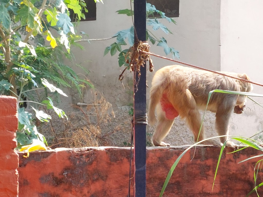 Sitter på altanen utanför våra rum och njuter av de sista solstrålarna. Här växer banan, papaya och flera träd med guava. Fåglarna för ett jäkla liv, sjunger inte som hemma, bara oväsen. På bordet låg nyss en banan, vips var den borta. En stor ap-hanne hoppade fräckt ner från taket och stal den. Snabbt som blixten och jag vågade inte utmana. Ashok och hans son för dagligen en kamp för att hålla aporna från sina guava träd. På natten kan apor ta sig in i köket, öppna kylskåpet och riva ut allt ätbart, berättade Ashok. Nu har de satt hänglås på kylskåpet. Nyckeln gömmer de.