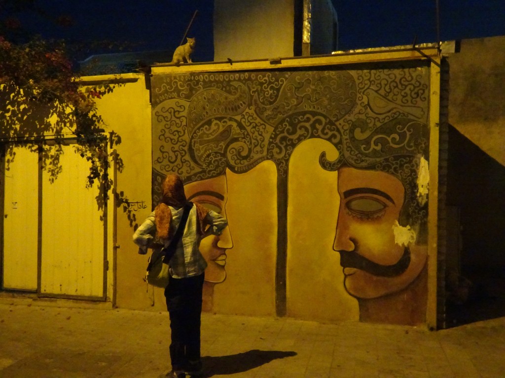 Lördagen med Yas och hennes väninna Samoneh, som också ordnade den obligatoriska inbjudan när vi sökte visum. Det blev kväll och månen en smal skära. På vägen hem ville hon ville visa väggmålningarna i Shiraz äldsta delar. Märkvärdigt och suggestivt i den svaga gatubelysningen med månskäran ovanför. Bilderna var filosofiska fantasier kring historia, sagor och den älskade poeten Hafes dikter. Som i en saga öppnades en port och ut steg den märklige konstnären själv, herr Abdel Yazdi med långt skägg och pigga ögon. Vi bjöds in till hans galleri, museum, konstnärens eget tempel. Små rum med utstuderad svag belysning i olika färger och musik med tonsatta dikter av gamla poeter. Det översta rummet hade ett trappsteg som lutade fel i två dimensioner. Konstruktionen var avsiktlig med tanken att rummet endast skulle kunna nås av ett fåtal. Allt tillsammans en andlig och tankeväckande upplevelse.