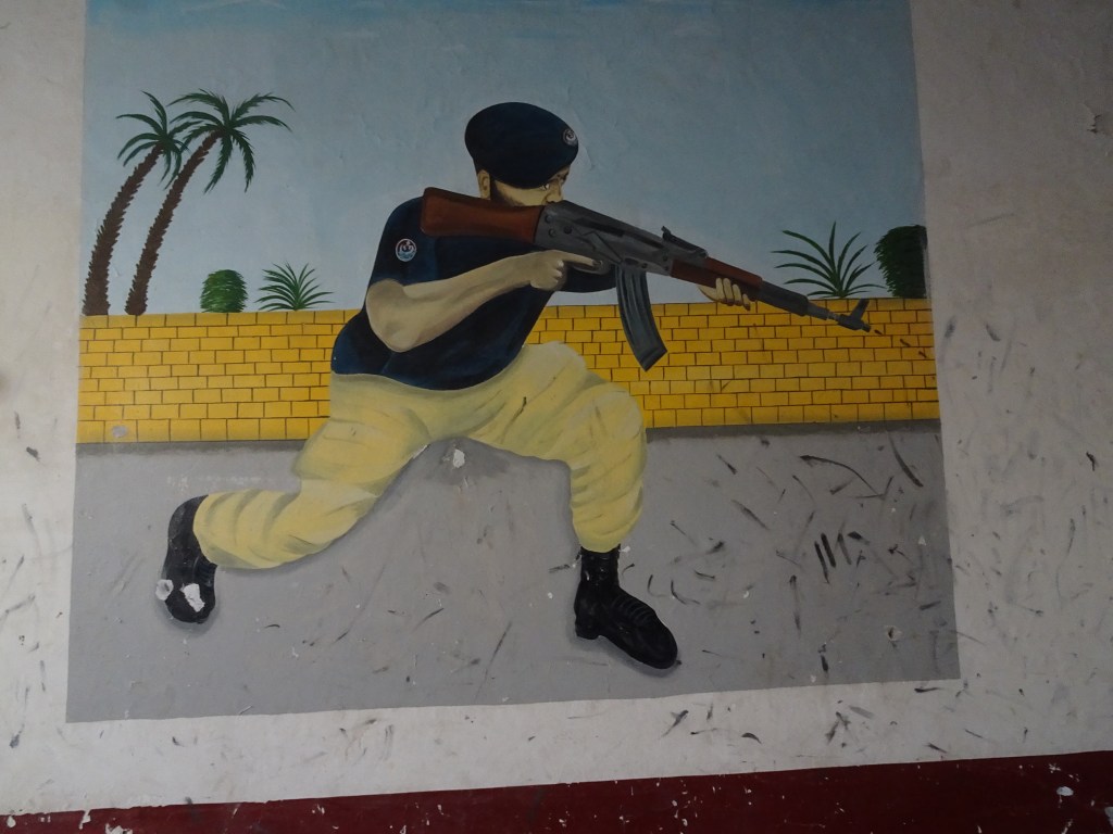 Bilen stannade i en by vid polisstationen. En liten lucka öppnas i den kraftiga järnporten. Någon kikar ut, tittar åt alla håll för att se om vi är vän eller fiende. Portarna öppnas och stängs snabbt bakom oss.