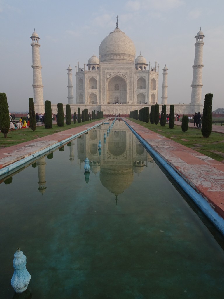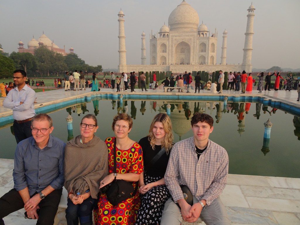 16. 11 – Dag 48. Nu skulle vi se världens underverk – Taj Mahal. Vi var där strax efter att solen gått upp. Själv hade jag varit här tidigare men, ”the Taj”, som många av respekt säger, är en upplevelse man aldrig kan fullt ut kan tillfredsställa. Byggnaden, som är ett mausoleum, tog endast 22 år att färdigställa med tjugotusen arbetare som arbetade dag och natt. Byggherren Shajahan var en galning, med vår tids mått, som ägnade sitt liv och rikets resurser åt att bygga monument över sig själv. Han son Aurangzeb insåg nog detta och lät klokt nog fängsla sin far på fortet för att stoppa honom från att bygga ett nytt planerat Taj Mahal. Detta i svart sten.