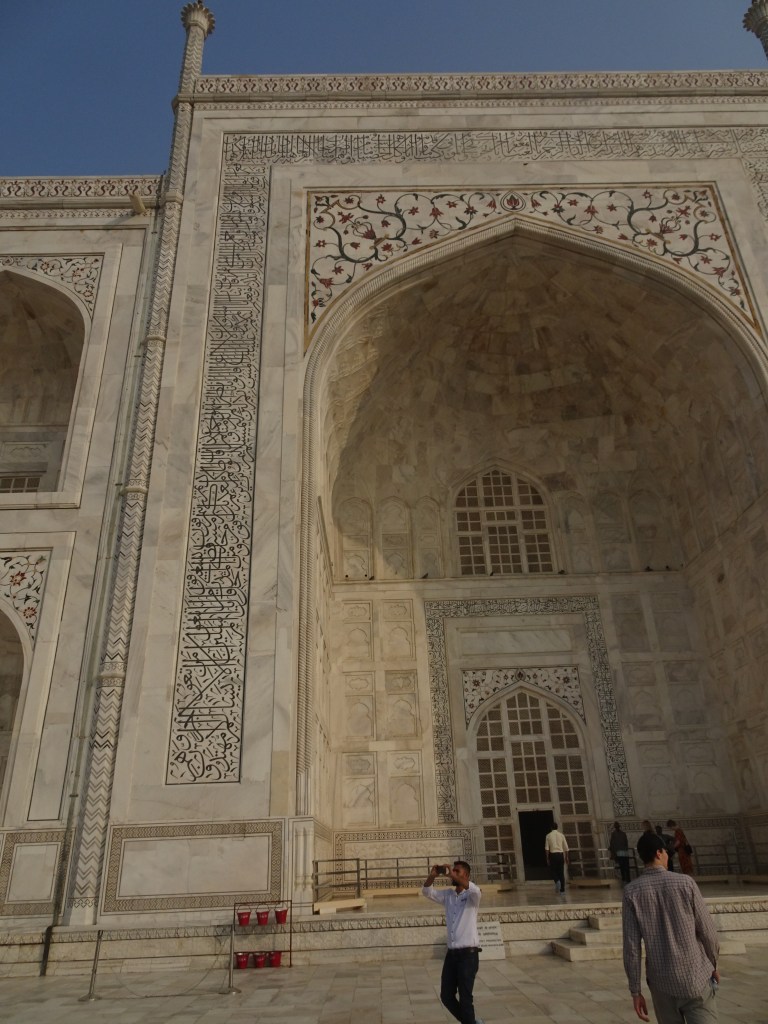En kopp te på morgonen. I minnet fanns the Taj kvar, men på något sätt känns det större, mäktigare än vad jag kunde minnas. Storleken och den perfekta symmetrin. Minareterna lutar två grader utåt, detta för att de vid en eventuell jordbävning inte skulle rasa på huvudbyggnaden. Optiska villor som att mer avlägsna föremål upplevs som mindre har trollats bort genom att storleken på texter ökar ju längre avståndet är från betraktaren. Klokt nog betalade jag för en guide. Han berättade att det här mausoleet som byggdes över kejsarens favorithustrus grav började byggas år 1631. Senare fick han själv här sin viloplats. Helt i skinande vit marmor och till synes oanfrätt av tiden. Skönt och fridfullt att gå på kall marmor.