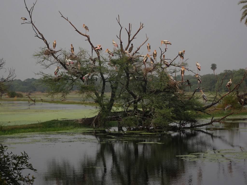 17-18. 11 – Dag 49-50. Tidigt på morgonen är det som gäller när man vill uppleva fågellivet. Hyrde cyklar och en guide. Kändes som att kliva in i ett aviarium, alltså ett rum med instängda fåglar. Plötsligt var vi omgivna av skrik, tjatter, krax, tjut och flax. Tror inte det var någon art som sjöng som våra svenska fåglar. Fåglar på marken, i acasia träden och svävande högt upp. 375 arter enligt senaste räkningen. Tyvärr ett minskande antal, men ändå fler arter än vi kan räkna till i Sverige (ca 250). Det här är våtmarker, inte naturliga, utan skapade av tidigare maharadjor. De byggde enorma dammar, inte av intresse för någon avifauna, utan för att skapa de bästa förutsättningarna för att kunna bjuda in kungligheter och brittiska koloniala potentater till fantastiska jaktfester. Massaker efter massaker har noga dokumenterats på den berömda stentavlan inne i parken. Det var inte så noga vilka fåglar som sköts, det var antalet som räknades som i en tävling. I statistiken skilde man på två sorters fåglar: short-legged och long-legged. T ex änder contra storkar.
