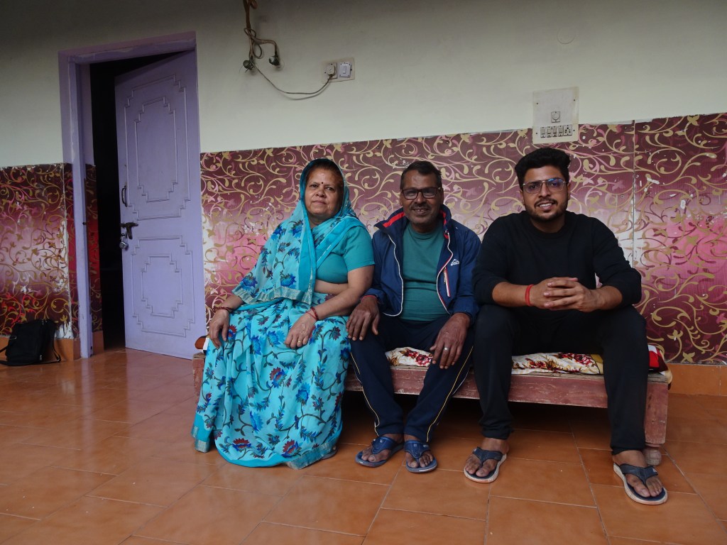 Indu, Ashok och sonen Shekar Faujdar utanför vårt rum.