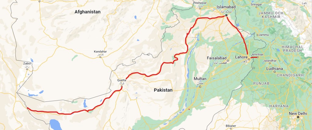 3.11 – dag 34. Vi lastar in oss i en täckt pickup med fyra säten, två isärtagna cyklar, spanjorerna och deras ca dussinet kolli, vi två, våra rullväskor och två poliser med Kalasjnikov. Full fart mot Quetta! Trodde vi!