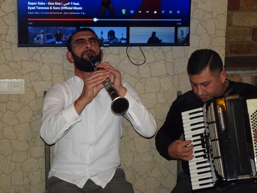 Vi fick presentera oss, senare hålla tal, vilket jag tror gick galant efter flera glas vodka. Musiken dånade och alla sjöng med i tydligen bekanta texter. Och vilka personligheter! Där berättar bilderna bättre. Dansen blev vild och medryckande. Till sist kunde jag inte hålla mig, upp och stampade med fötterna och härmade deras armrörelser. Det gick hem och jag pussade sötaste flickan när vi lämnade efter ett par timmar.