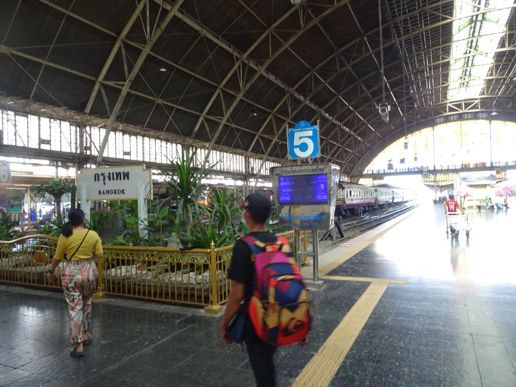 5.1 Dag 96. Tåg rakt österut. Bangkoks järnvägsstation byggdes år 1901 och har kvar den gammeldags charmen. De första 45 minuterna gick tåget under Airport Airlink, eller rättare: Denna hade byggts över den gamla järnvägen. Järnvägen känns märkligt föråldrad, här har thailändarna verkligen inte satsat. Stort tåg, men på smalspår och inte elektrifierat. Här skulle jag vilja föreslå lite indiskt bistånd.