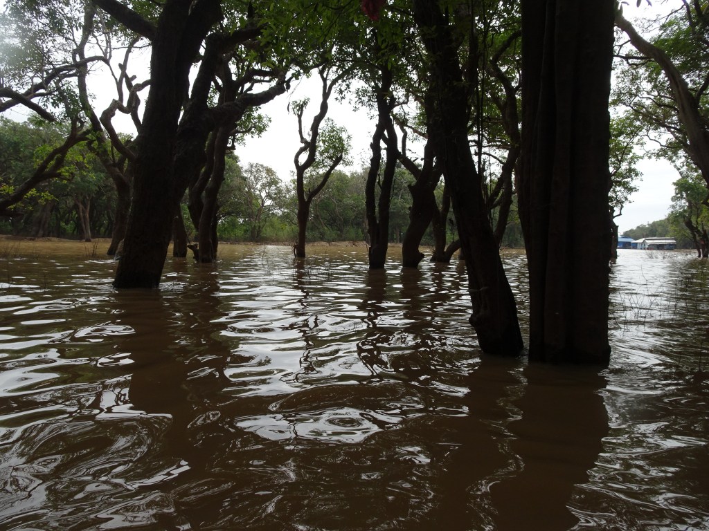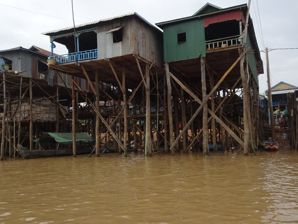 Samme guide tog oss ut till den stora sjön Tonle Sap som dominerar centrala Kambodja. Monsunregnen är över i september och i fiskebyn Kampong Phluk står husen nu på pålar fem meter över marken. Allt luktade fisk, som torkades, röktes, maldes till fiskolja. Enligt guiden var det inte tillåtet för turister att övernatta här. ”No security”, förklarade han.