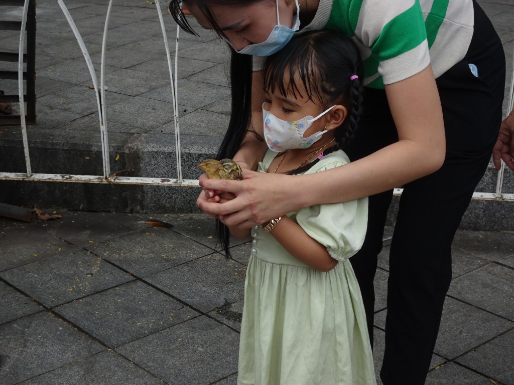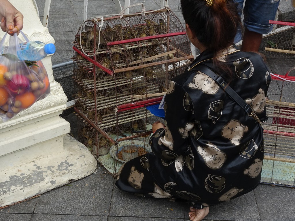 Längs de stora boulevarderna var det ganska lätt att gå på trottoarerna och ganska behändigt att gå till platser i centra staden. Tillfällen till motion måste alltid tas tillvara. Vi gick till en pagoden Wat Phnom belägen uppe på en brant kulle mitt i staden. Buddhismen uppmanar till godhet mot allt levande. Att ge en fången fågel frihet, bör därför uppfattas som en god handling.
