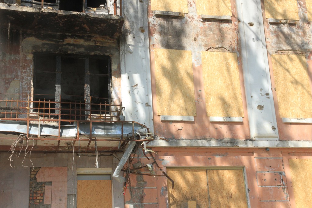 Här dog 37 människor. Jag känner igen bilden från svensk TV. Kanske var fjärde hus är skadat eller raserat. Nu Har Oleksy dragit igång textilfabriken och syr kläder till soldater. Han påpekar att det viktigaste är att ordna arbete till alla flyktingar. Att leva på bistånd gör varje människa bekväm. Folk blir lata! Förlorar motivationen.