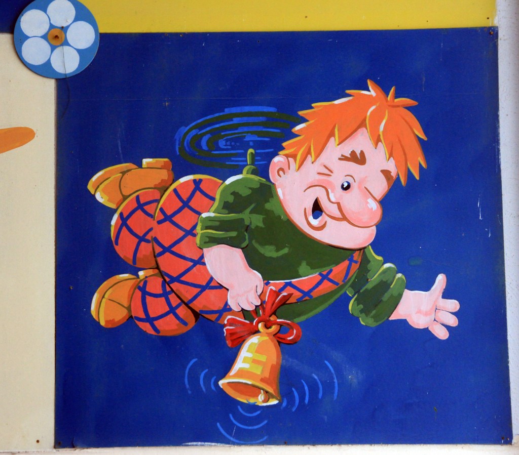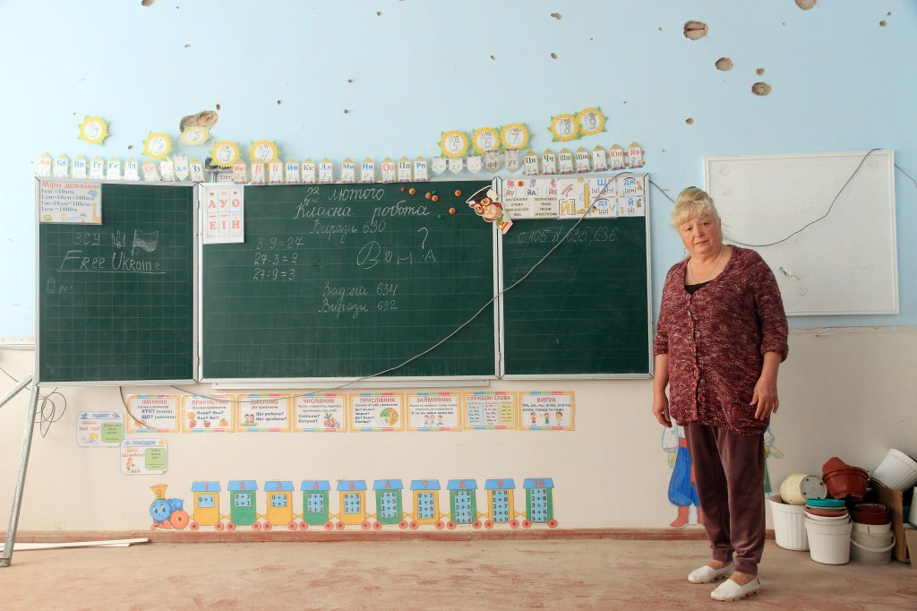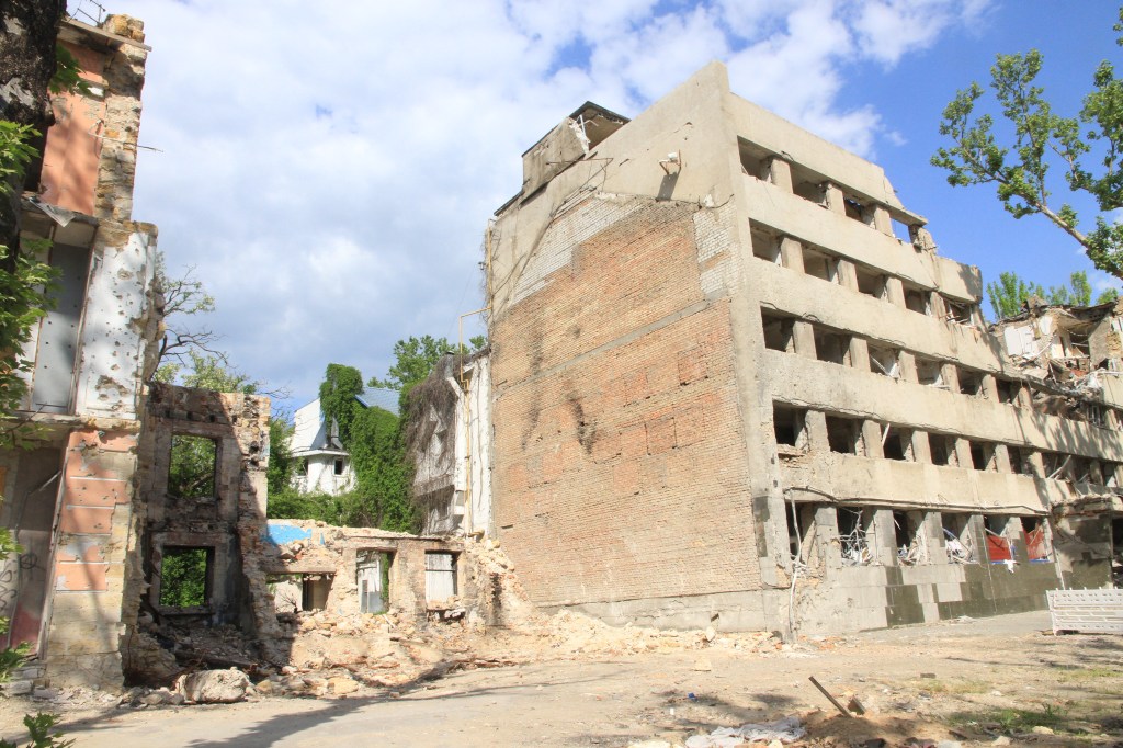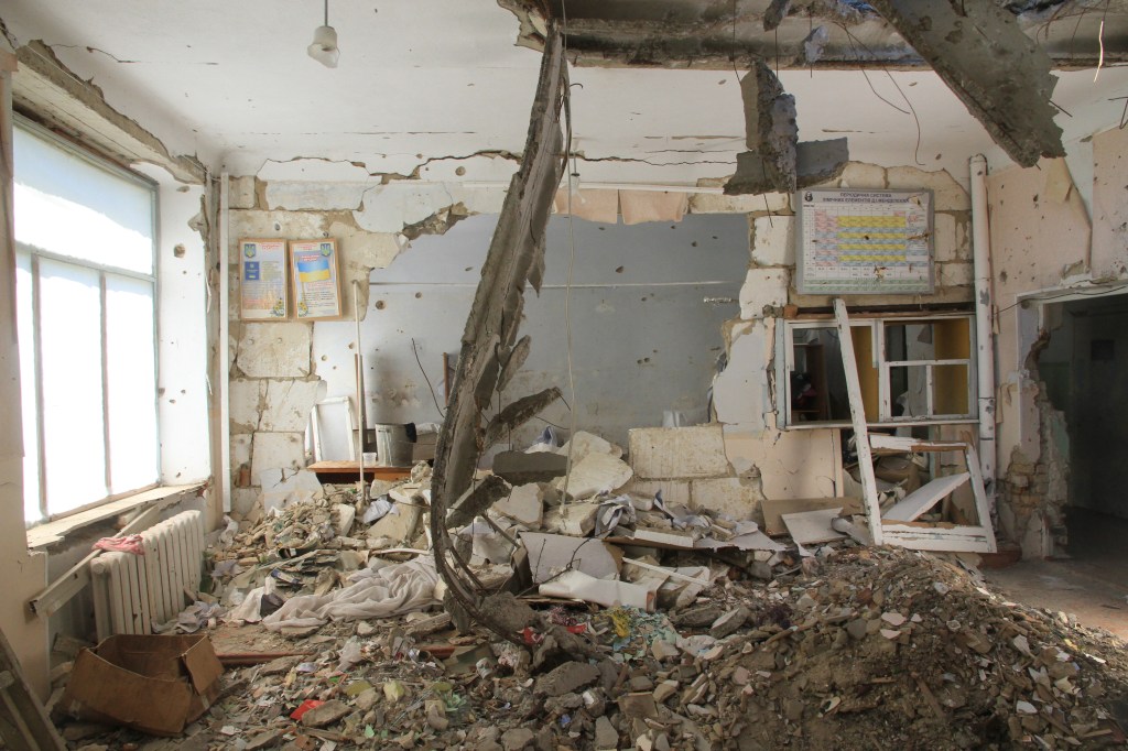 Vi gick in i den nästan helt förstörda skolan. Ett klassrum var helt orört efter sista skoldagen 24.2 2022. Såg ut som det varit en fin skola med höga ambitioner. Där fanns en bild av Karlsson på taket, en välkänd figur i Ukraina.