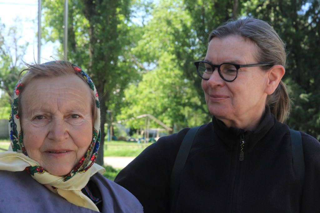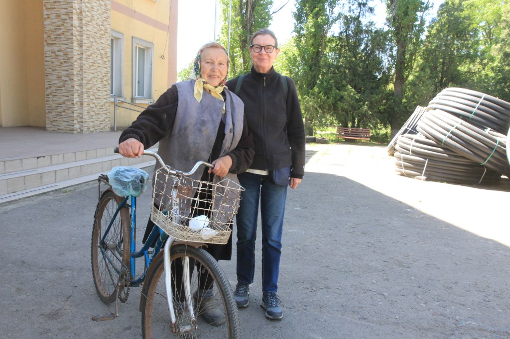 lördag 4.5. I dag tar oss Oleksy ut till byar som ockuperades av ryssarna i två veckor. Byn Shevchenkove ligger bara 40 km från fronten i där den är i dag, nära staden Kherson. Vi står utanför det delvis förstörda kulturhuset. Olga 67 leder sin cykel, kommer fram till oss och säger genom tolk;